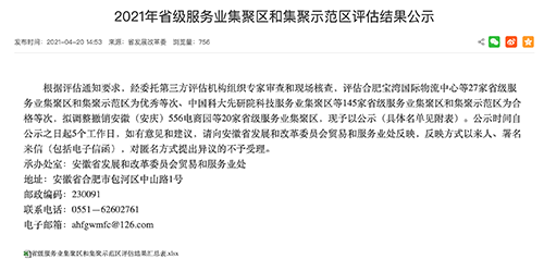 近日,安徽省发改委公示了2021年省级服务业集聚区和集聚示范区评估结果,合肥jjb科技城科技服务集聚区获评省级“优秀科技服务集聚区”。服务业集聚区和集聚示范区是服务业集聚发展的重要载体,根据《安徽省省级服务业集聚区和集聚示范区认定管理办法》,对集聚区和集聚示范区实行动态评估制度,每三年评估一次,不合格的调整撤销,不参加相应类别评估的,视为不合格。经委托第三方评估机构组织专家审查和现场核查,此次全省有15家省级服务业集聚区和12家省级服务业集聚示范区拟被评为优秀等次;145家省级服务业集聚区和集聚示范区被评估为合格等次。